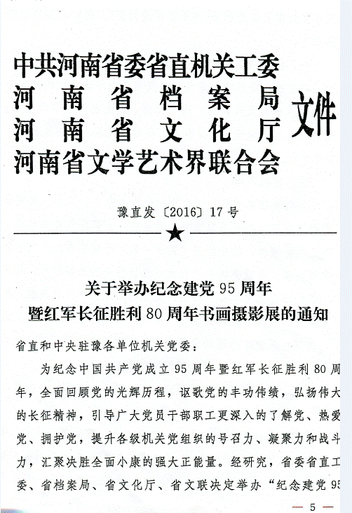 附件2:《中共河南省省委省直机关工委 河南省档案局河南省文化厅 河南省文学艺术界联合会<关于举办纪念建党95周年暨红军长征胜利80周年书画摄影展的通知>》(豫直发[2016]17号)